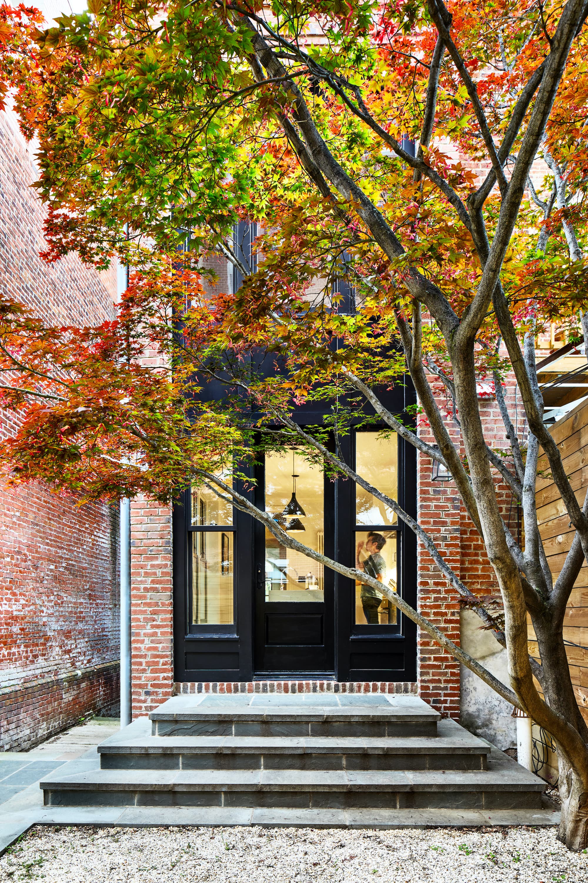 As a part of a whole house renovation of this rowhouse in DC’s Shaw Historic District, an architectural language was developed to be consistent with the home’s history. Throughout the house, the strategic use of pilasters and beams, large cased openings, and focal points such as the salvaged and restored fireplaces and other architectural details provides clear definition to each room while creating connectivity and continuity throughout the space. At the exterior, an appropriately scaled garden facade was designed to relate to the new terrace and garden. New brickwork references exterior details from the front of the house, incorporating corbels, arches, and brick patterns.