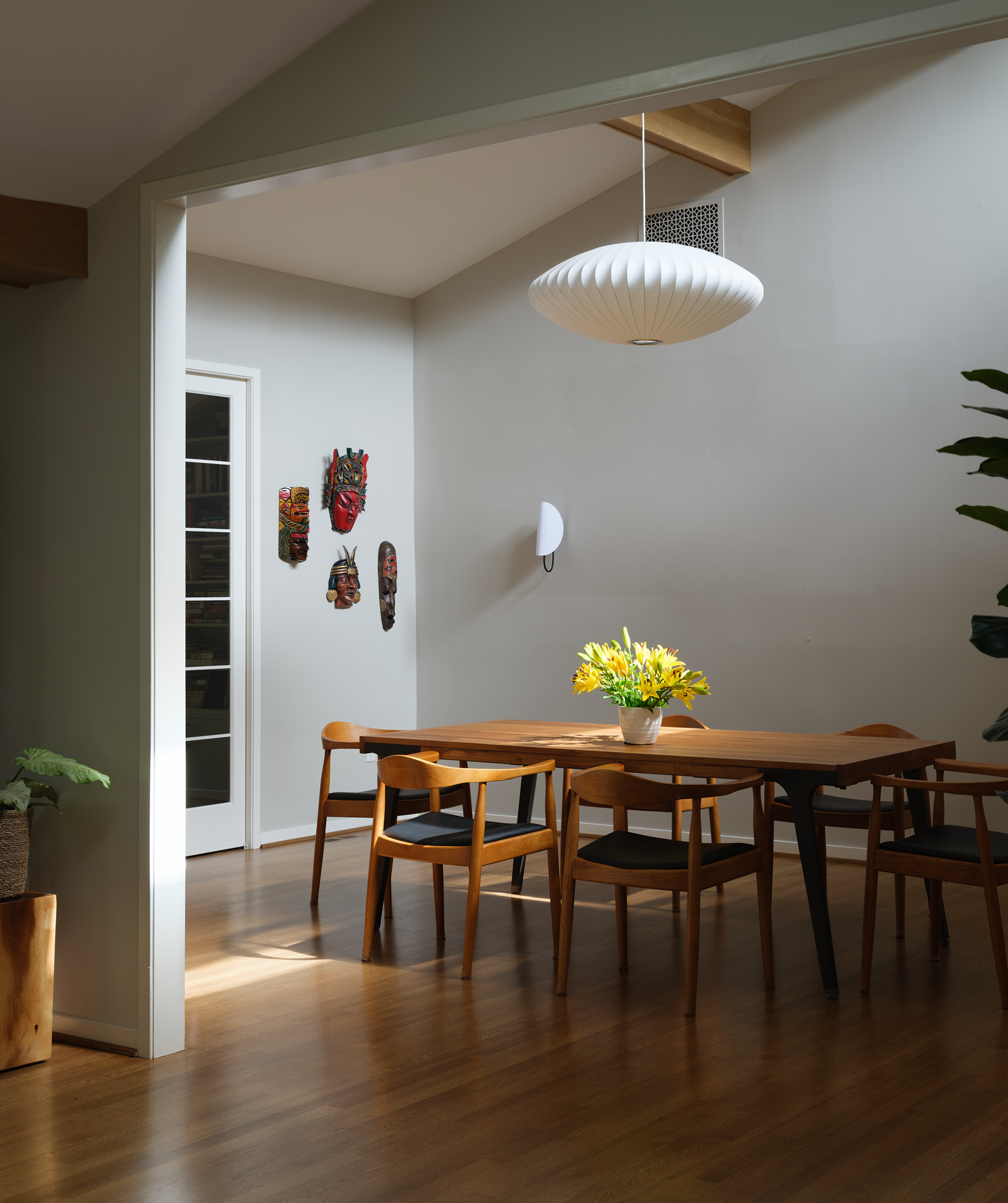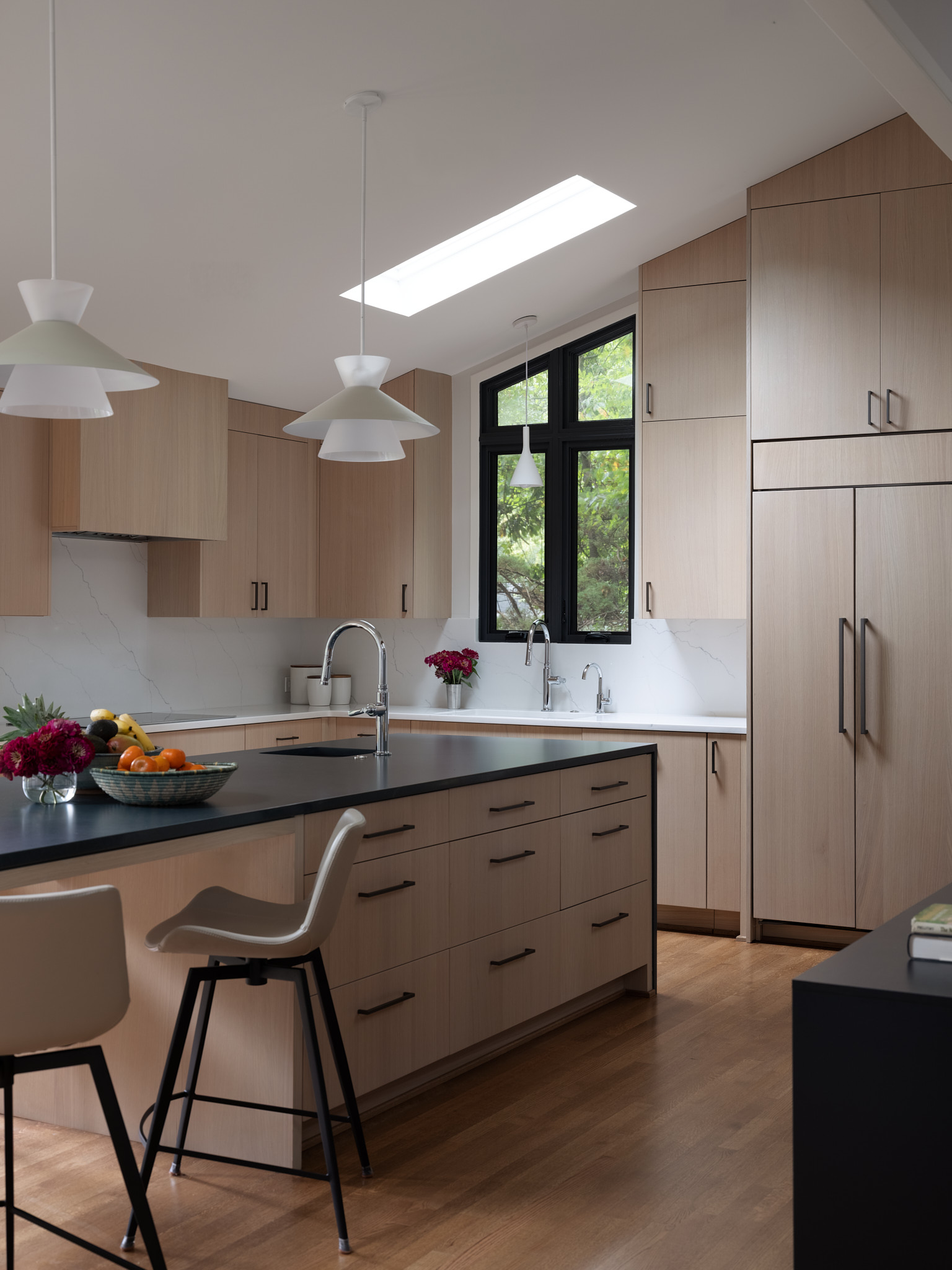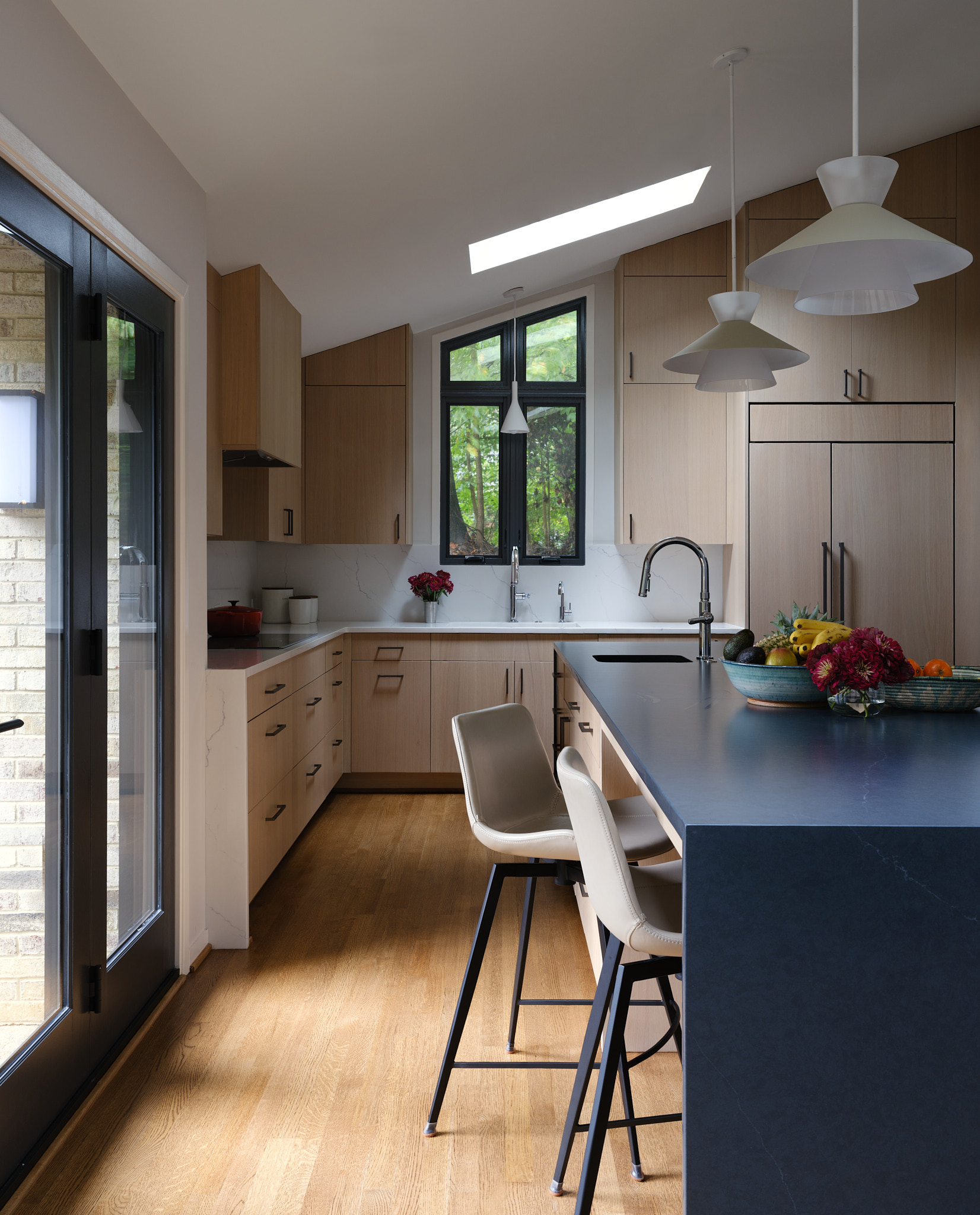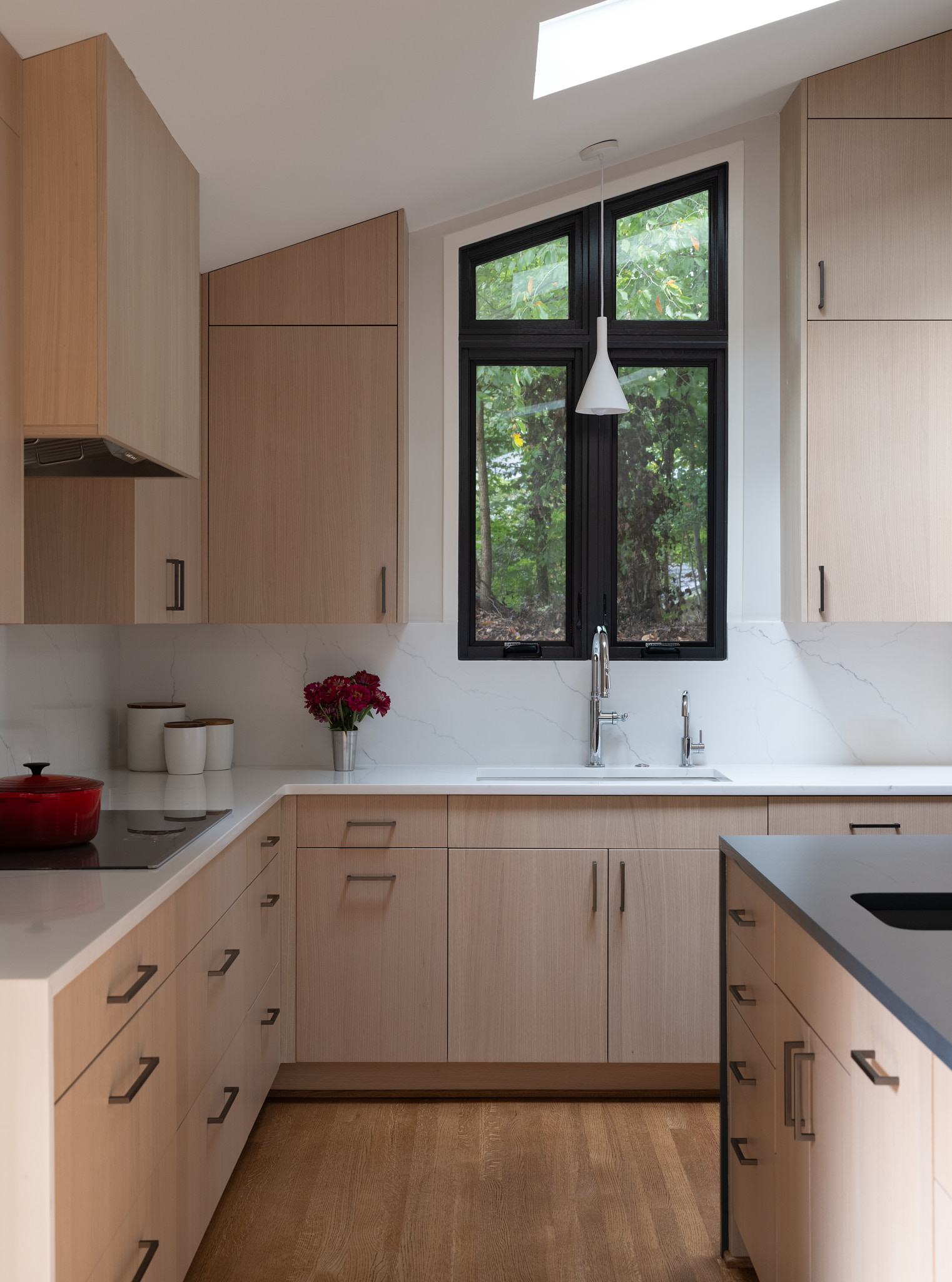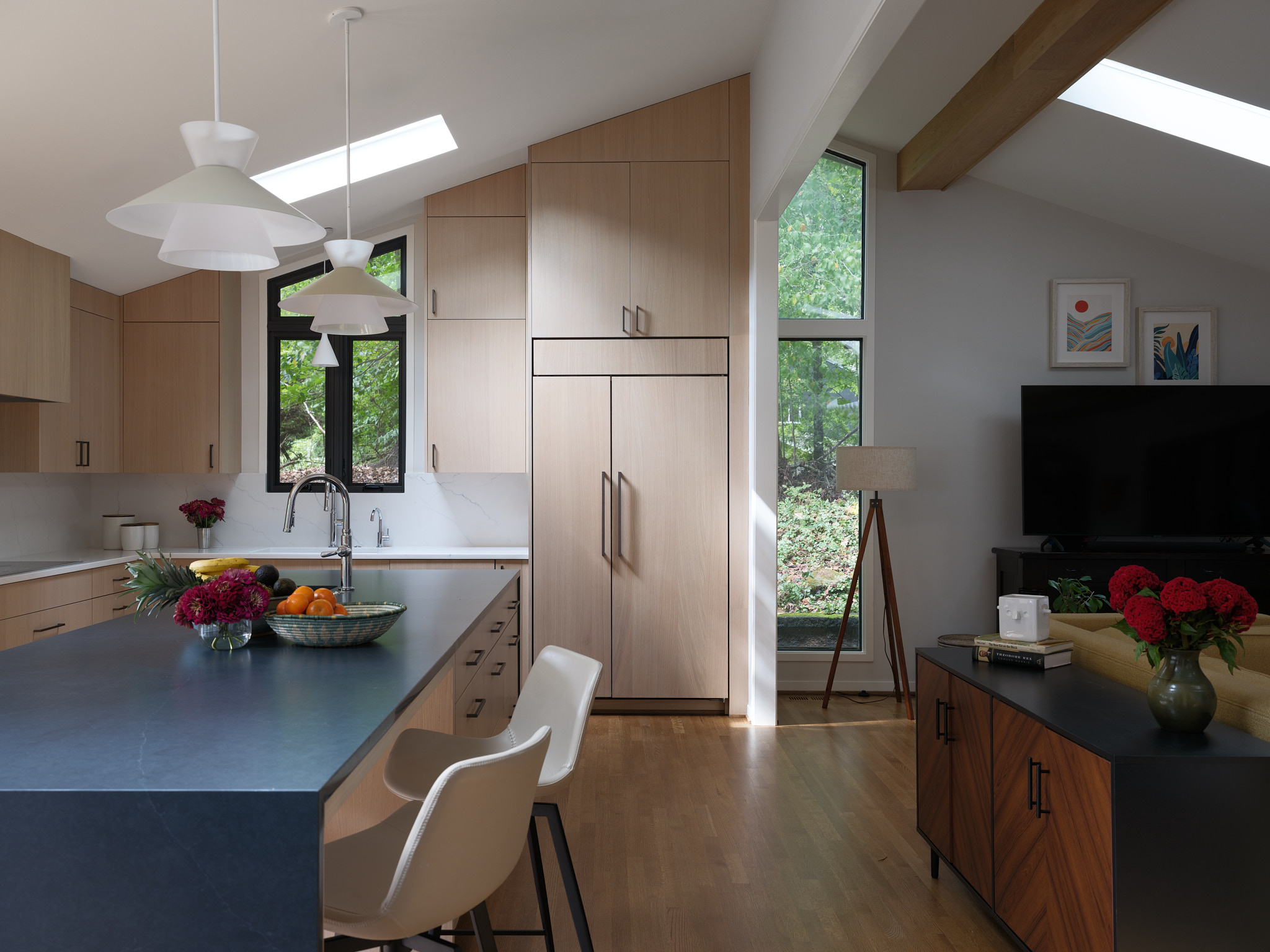 Nestled in the Cabin John neighborhood of Bethesda, MD, this mid-century split-level home was reconfigured to better support family gatherings and entertaining. The primary living floor was strategically opened and refined, with an expanded kitchen and living room connected to a gracious screened porch addition. Connections between rooms were enlarged to take advantage of the generous ceiling heights and draw daylight deep into the interior. A simple yet refined palette of natural materials, clean lines, and simple forms was embraced, emphasizing the simplicity and warmth of the original architecture and creating a serene and expressive home.