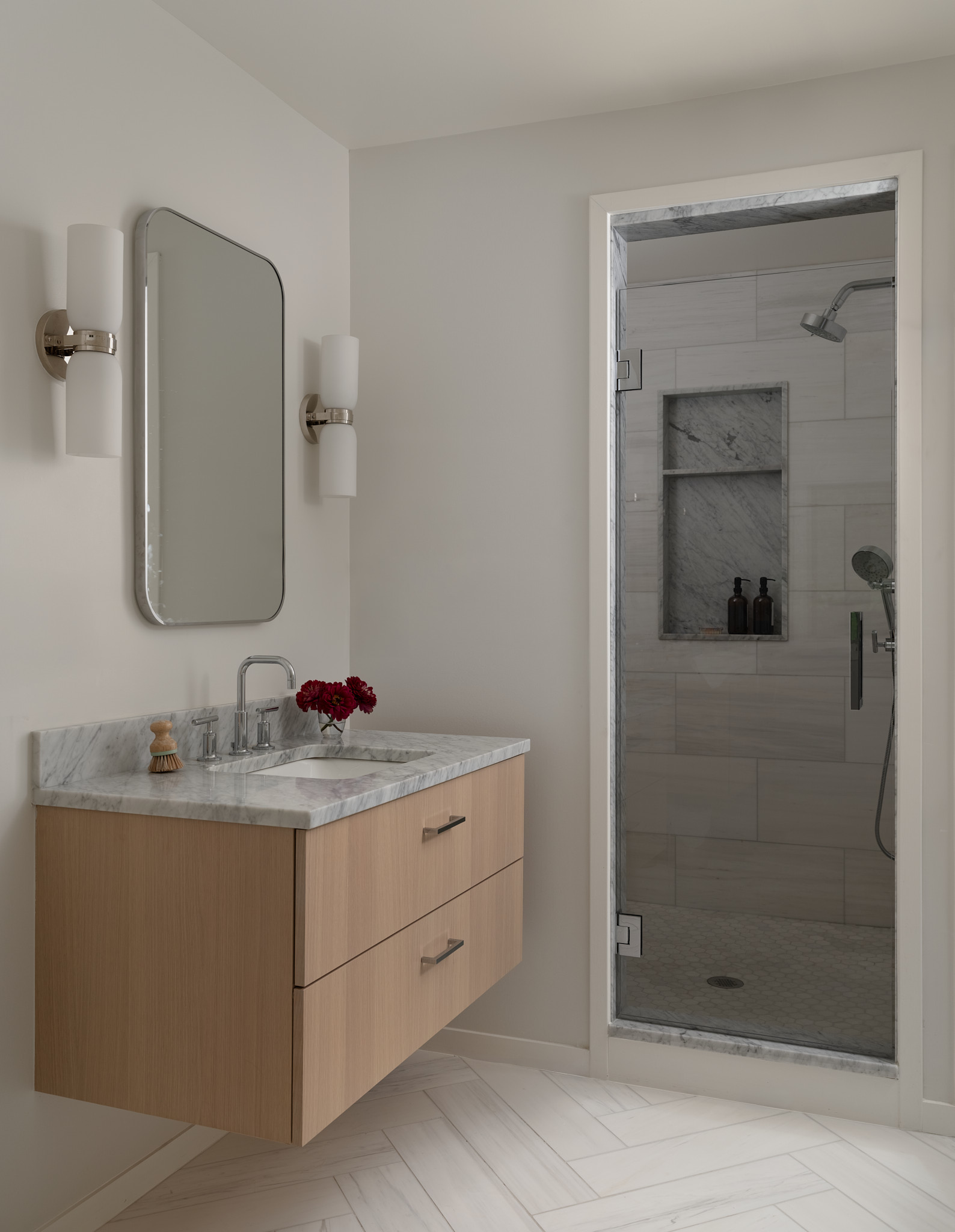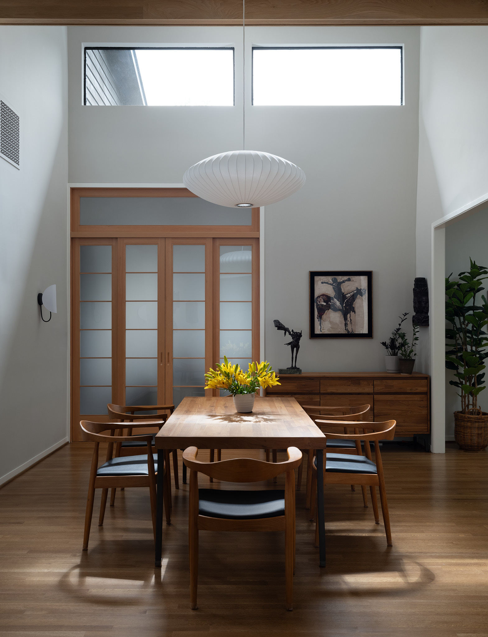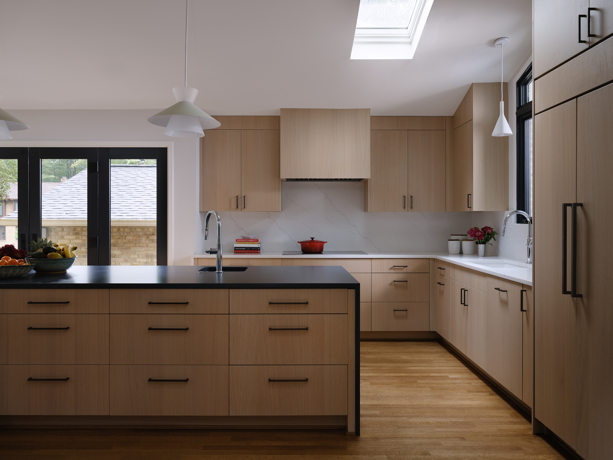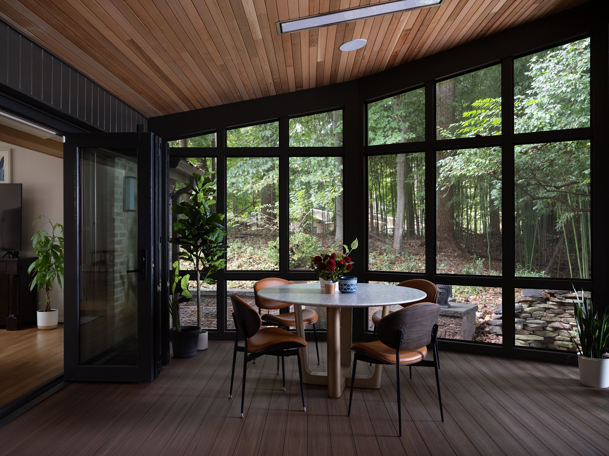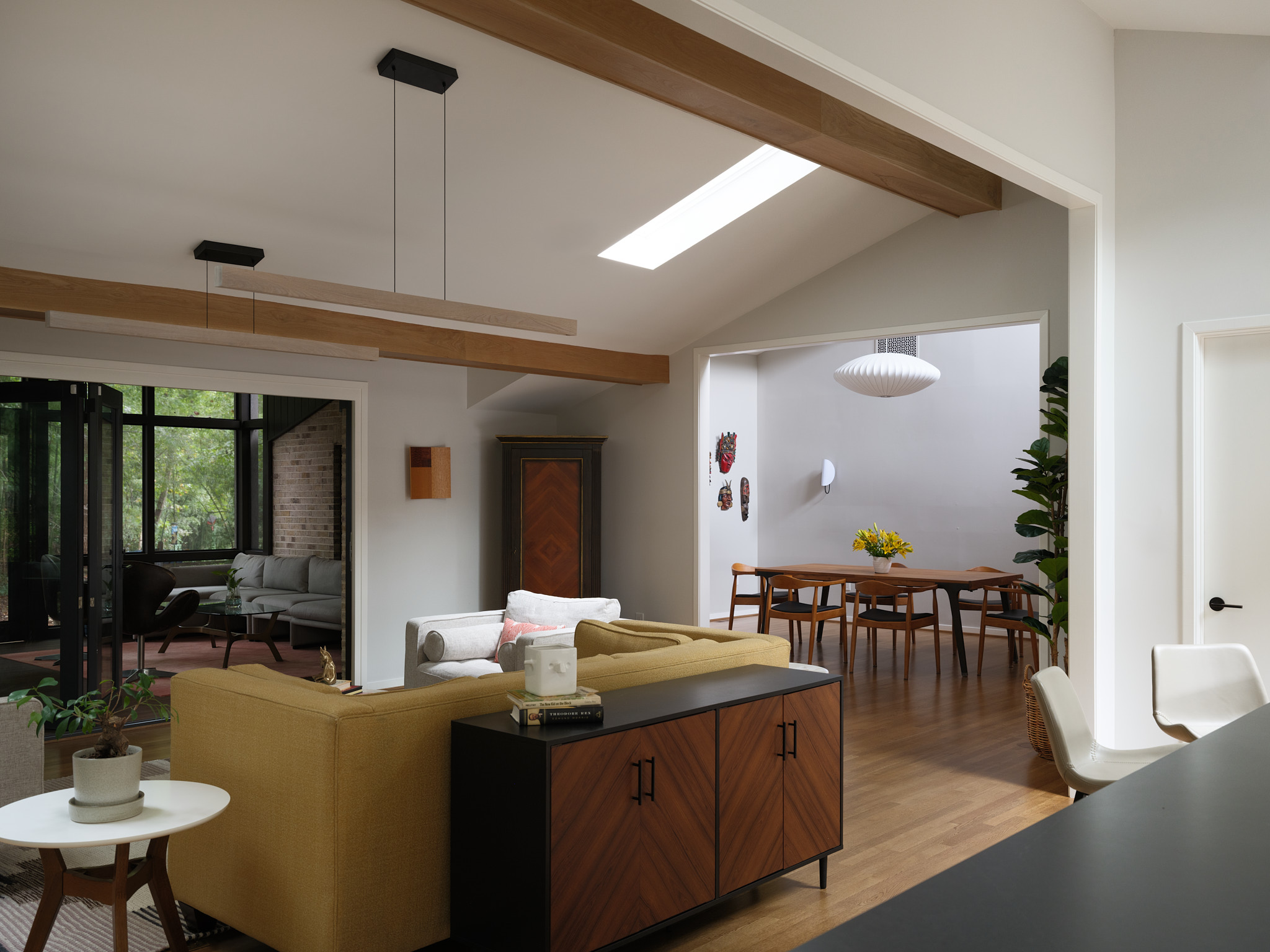 Nestled in the Cabin John neighborhood of Bethesda, MD, this mid-century split-level home was reconfigured to better support family gatherings and entertaining. The primary living floor was strategically opened and refined, with an expanded kitchen and living room connected to a gracious screened porch addition. Connections between rooms were enlarged to take advantage of the generous ceiling heights and draw daylight deep into the interior. A simple yet refined palette of natural materials, clean lines, and simple forms was embraced, emphasizing the simplicity and warmth of the original architecture and creating a serene and expressive home.